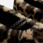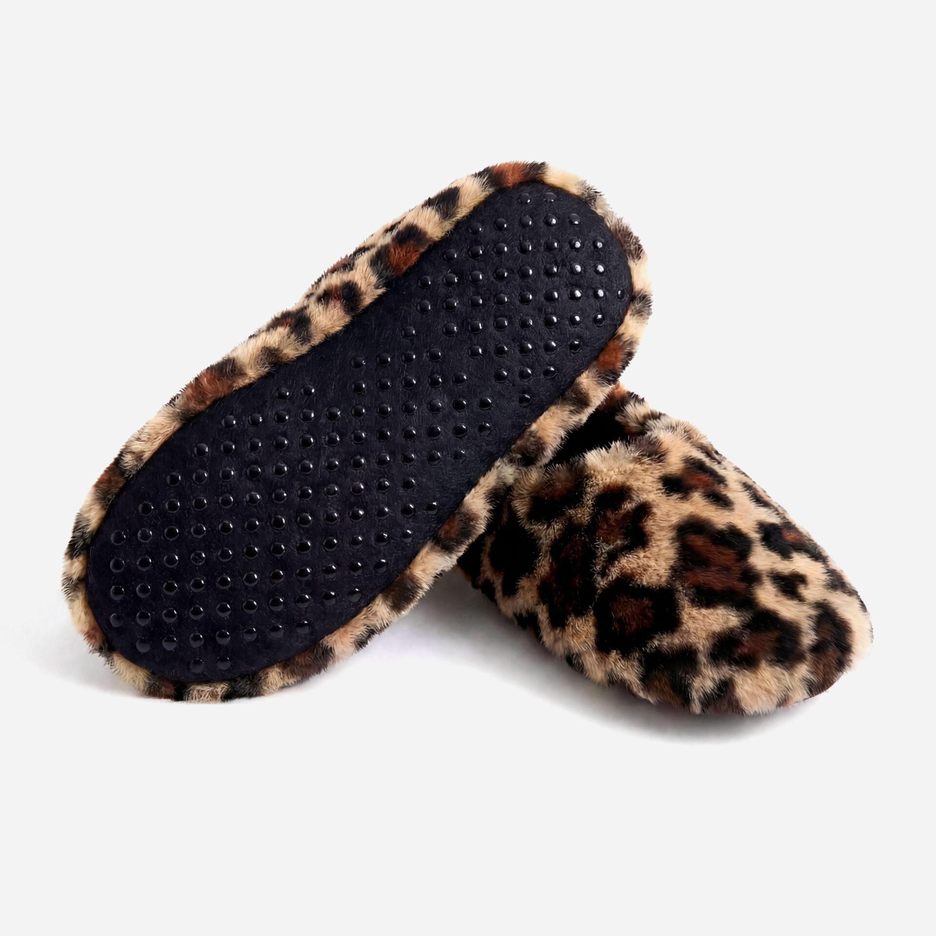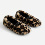 A pair of slipper socks in a faux fur, animal print design