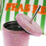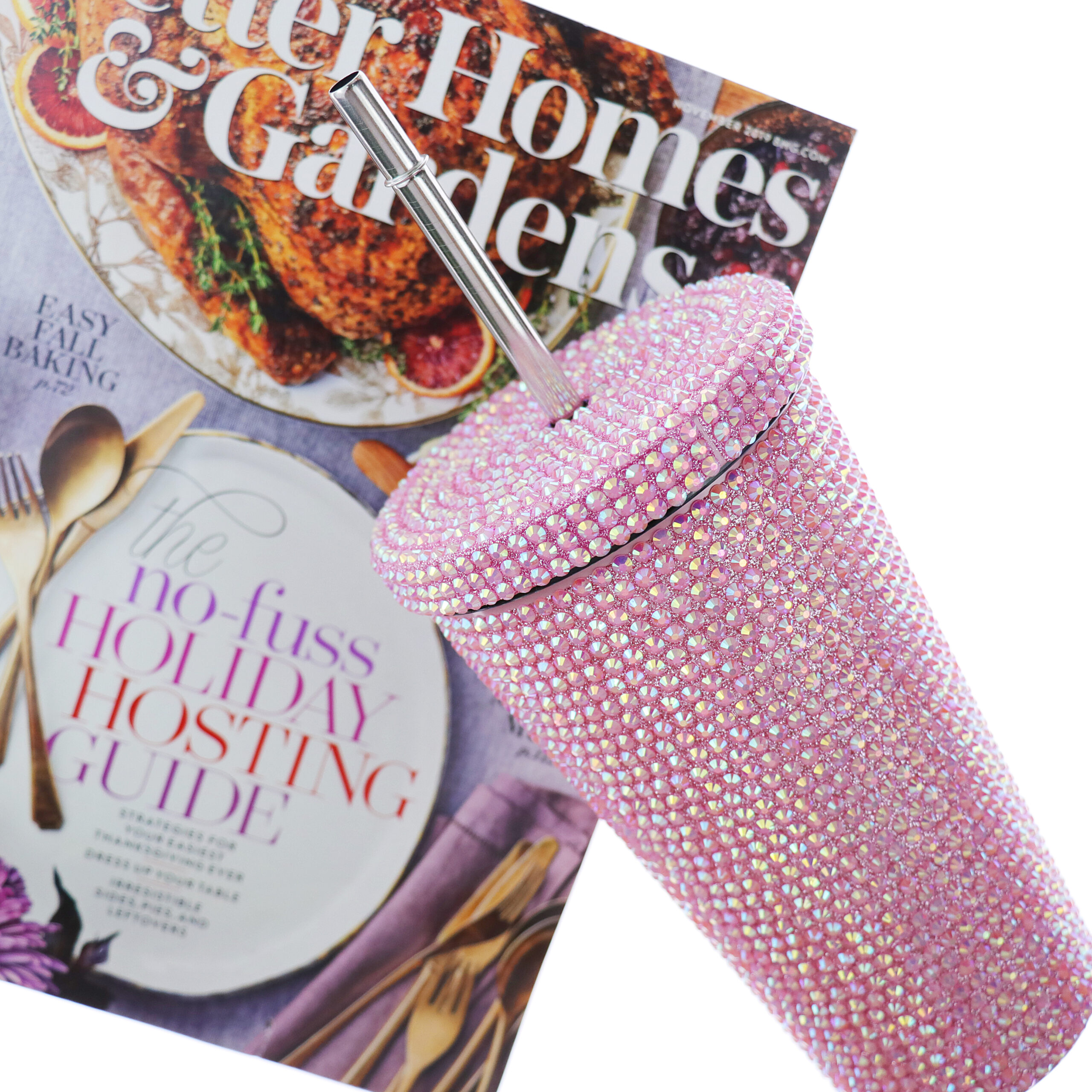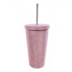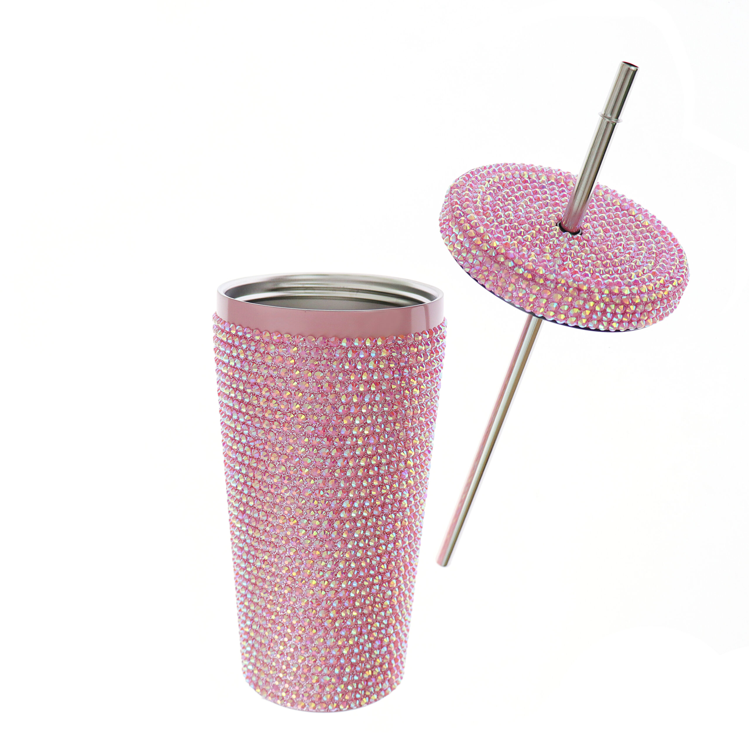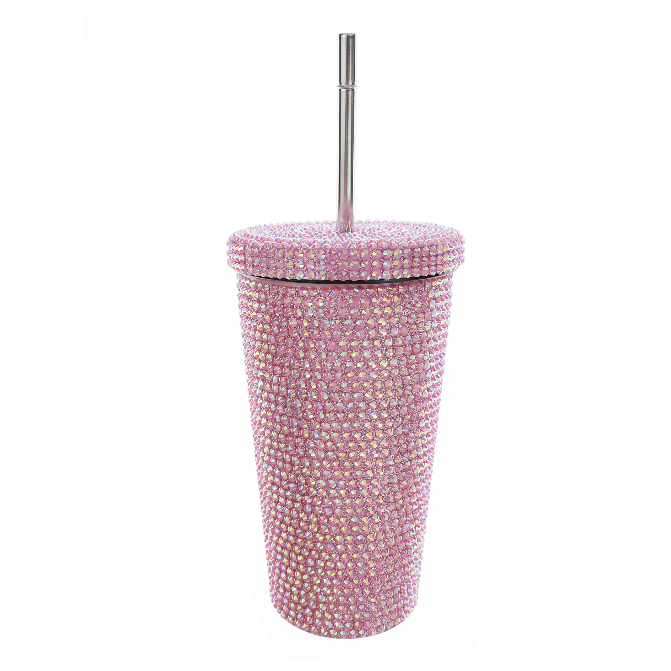 The cup’s surface is densely adorned with pink and iridescent crystal embellishments, creating a dazzling, luxurious appearance.