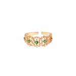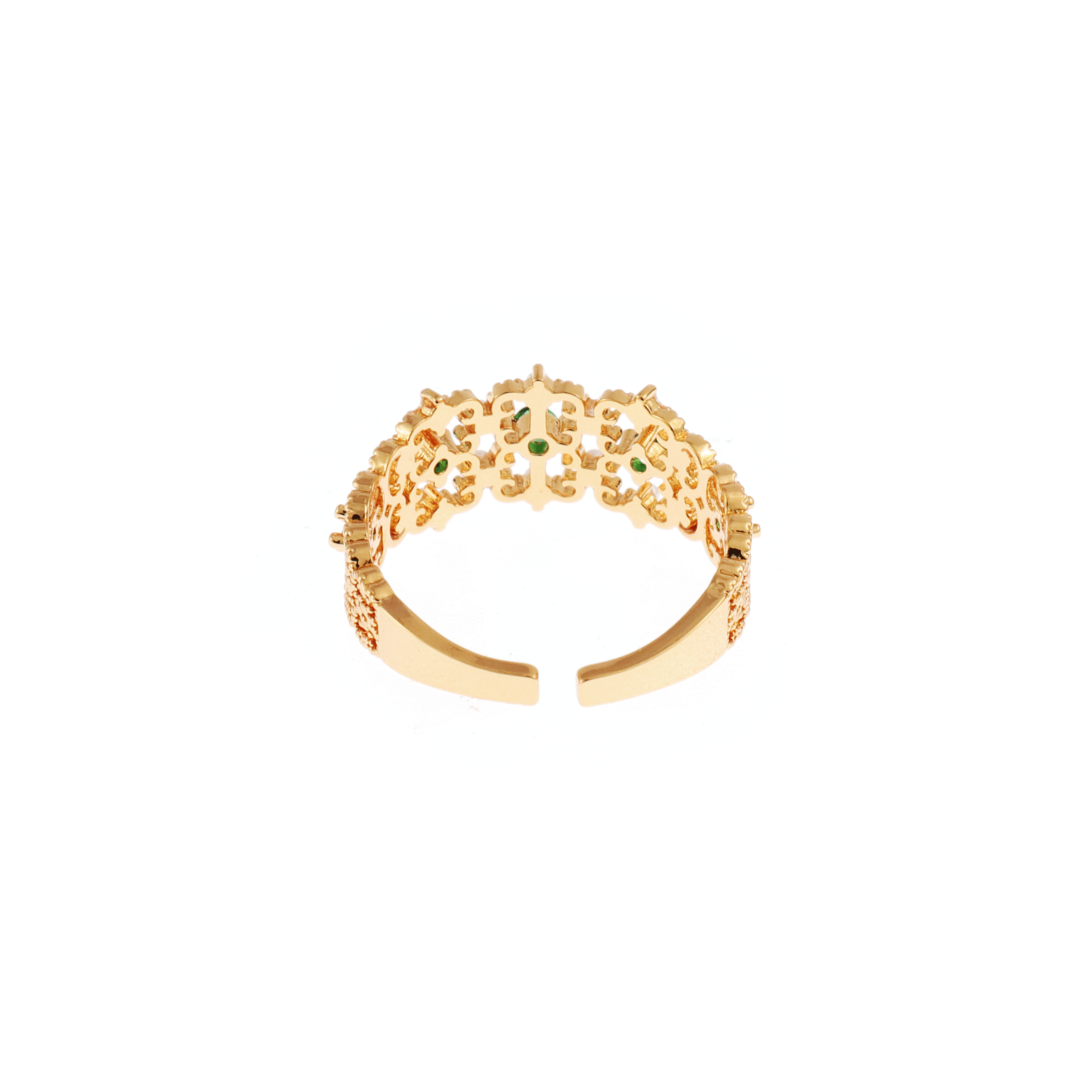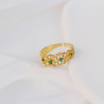 This exquisite ring showcases intricate craftsmanship with its lavish golden band adorned with detailed engravings and floral motifs.