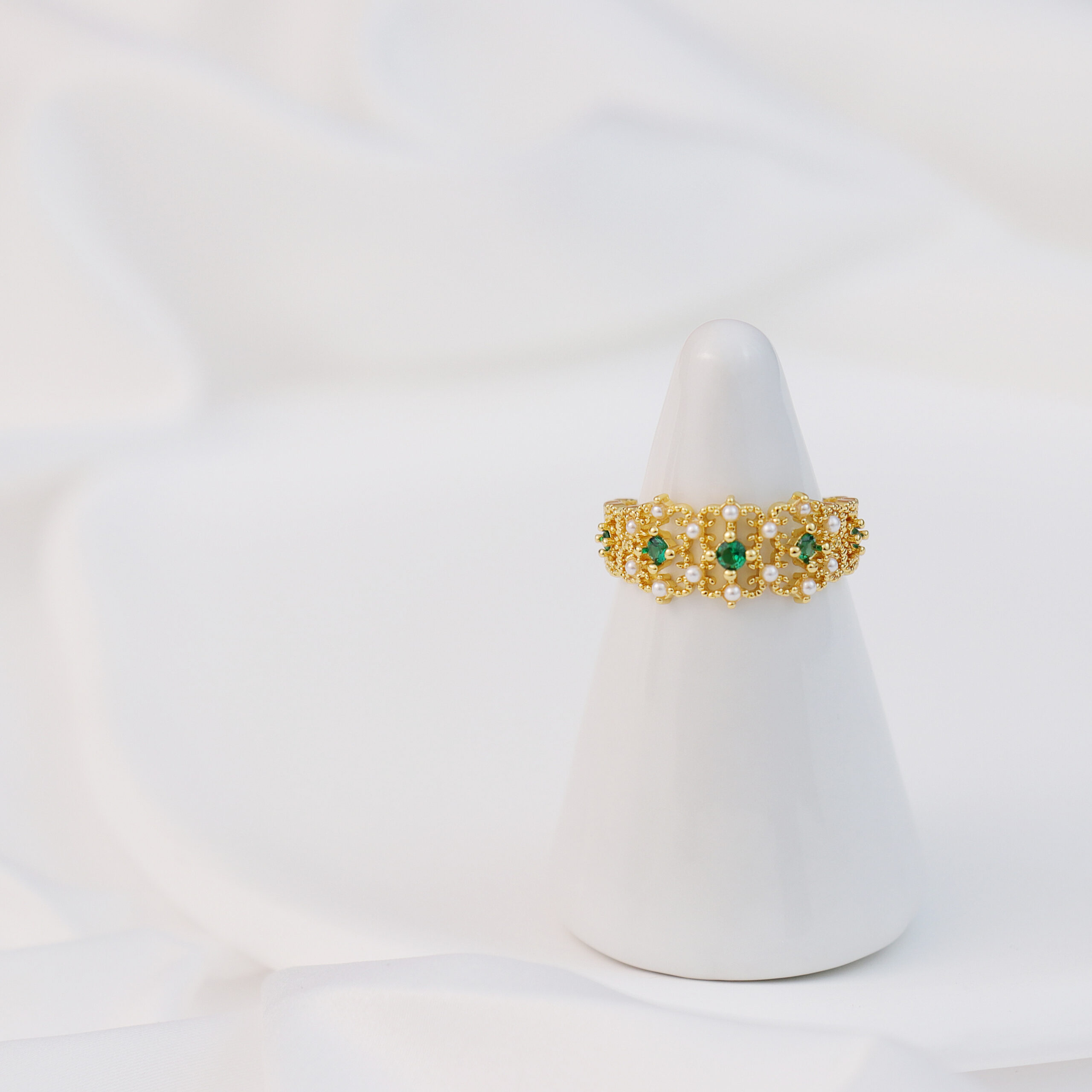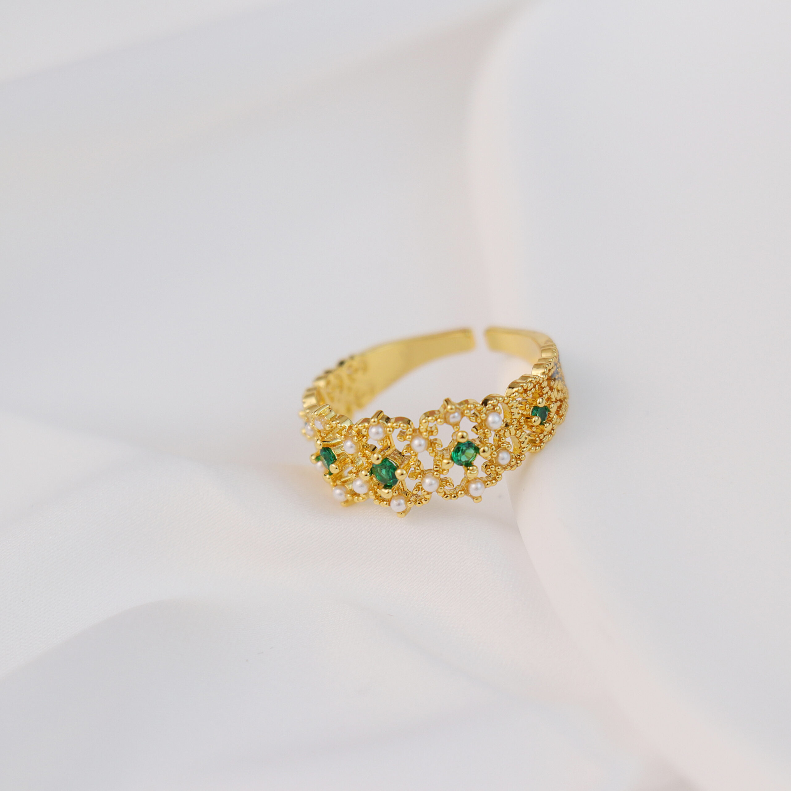 Delicate emerald-green gemstones and lustrous pearls are artfully set along the design, creating a harmonious blend of opulence and sophistication.