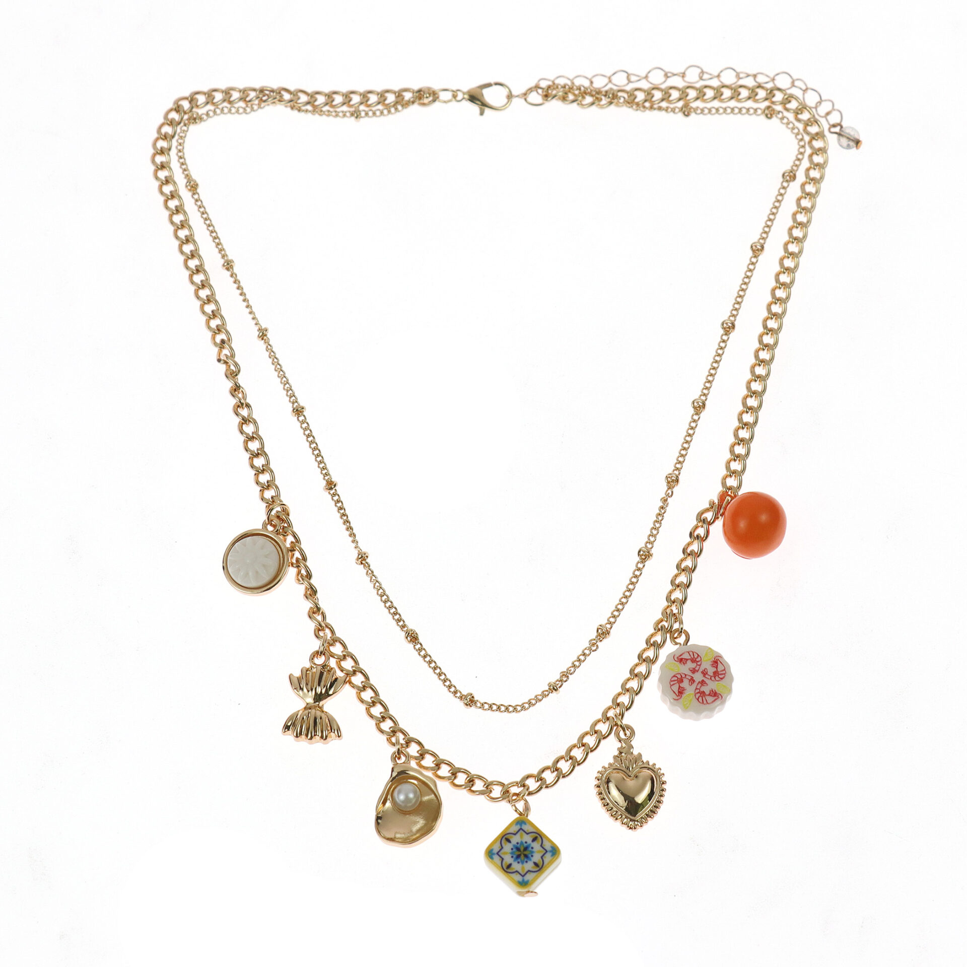 A bottom layer with a mother-of-pearl disc, a pair of scallop shells, a baroque faux pearl, an enamel tile charm, and a textured heart charm