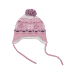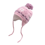 Hat in a jacquard knit in snowflake pattern  with a pompom on the top, earflaps and braided ties. Fleece lining.