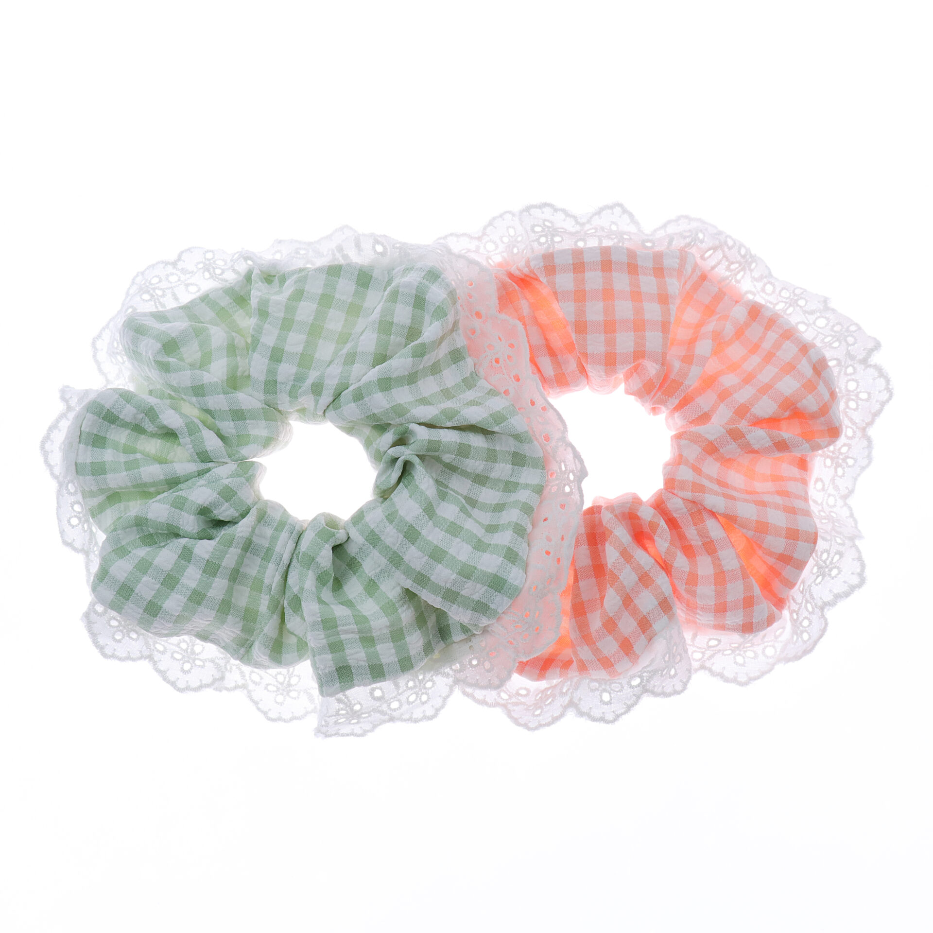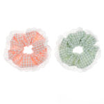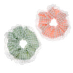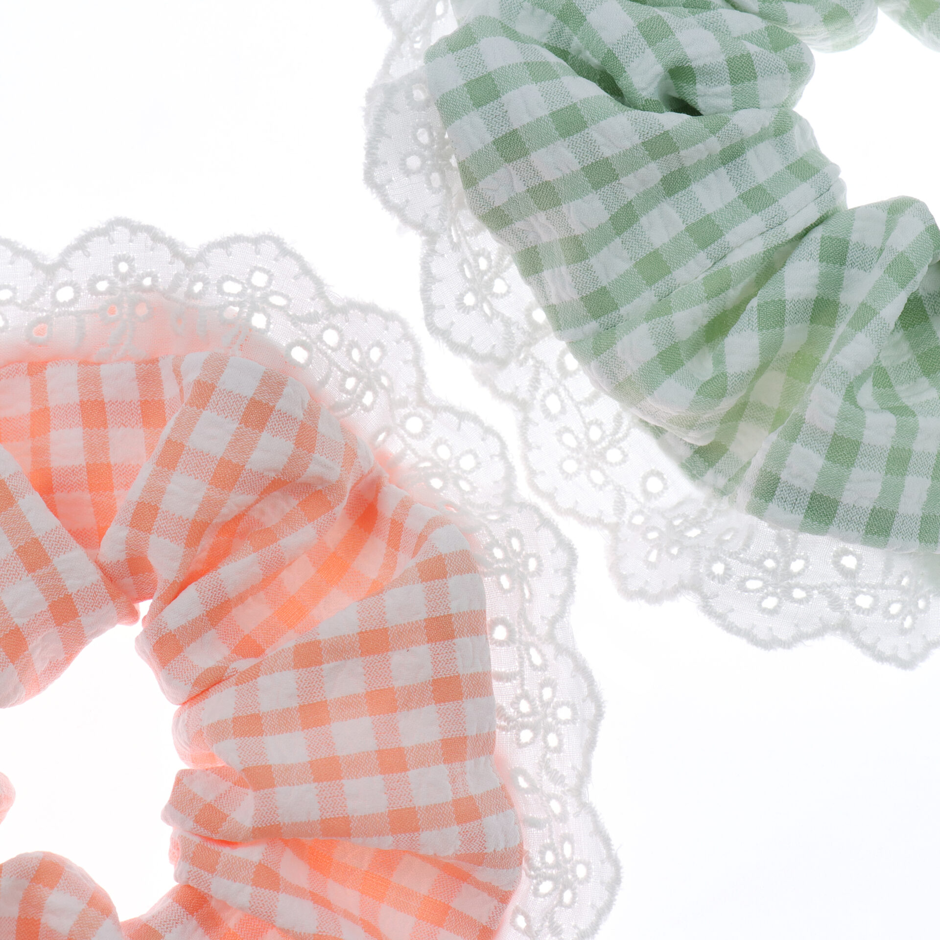 These cute gingham scrunchies feature a delicate lace trim, adding a sweet, vintage-inspired touch to any hairstyle. Made with soft, breathable fabric, they are gentle on hair and suitable for daily wear, parties, or casual outings. The stretchy elastic band ensures a secure yet comfortable fit for all hair types. This 2-piece set includes a fresh green and a warm coral-orange gingham design, perfect for mixing and matching with your outfits or sharing with a friend.