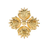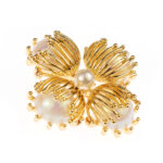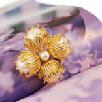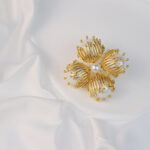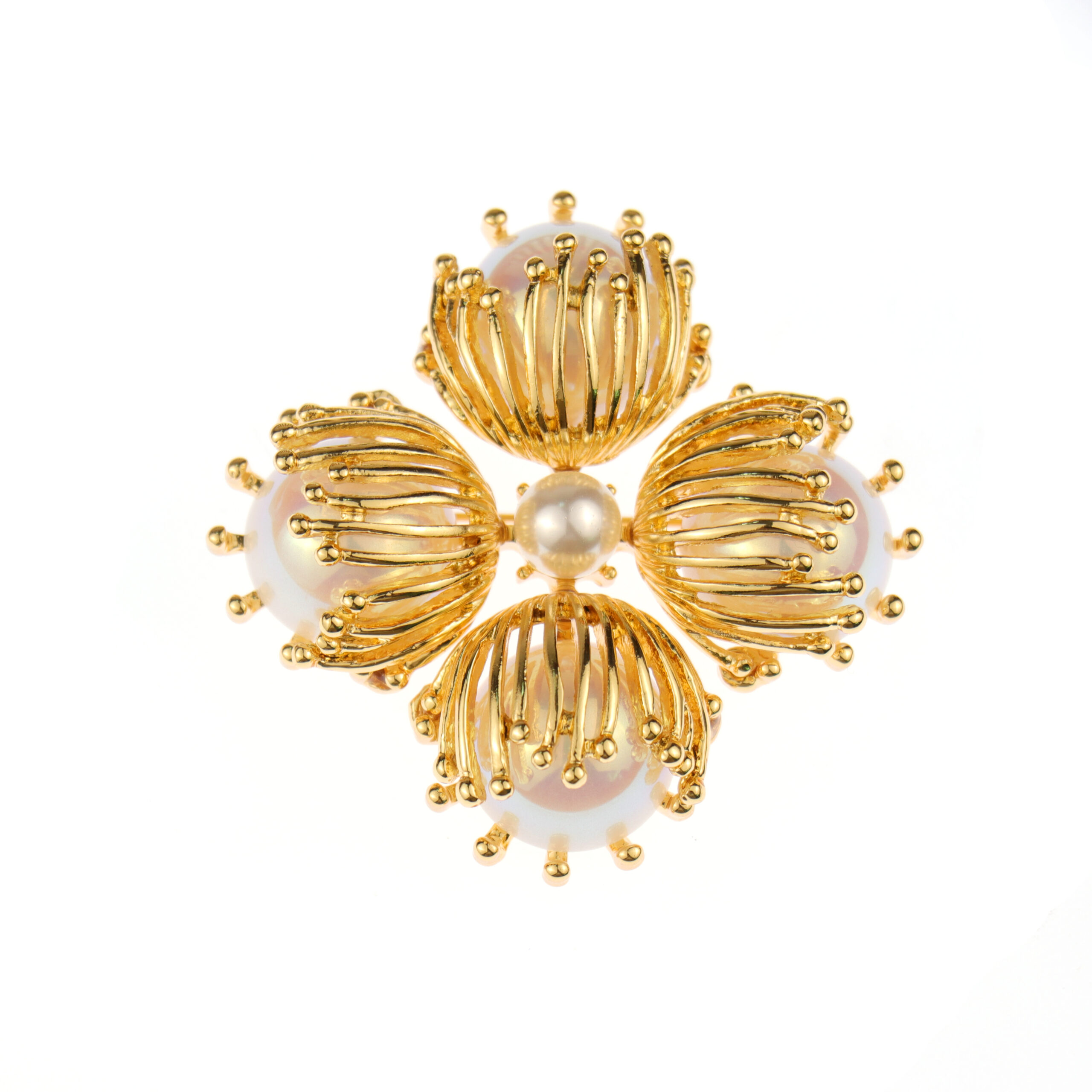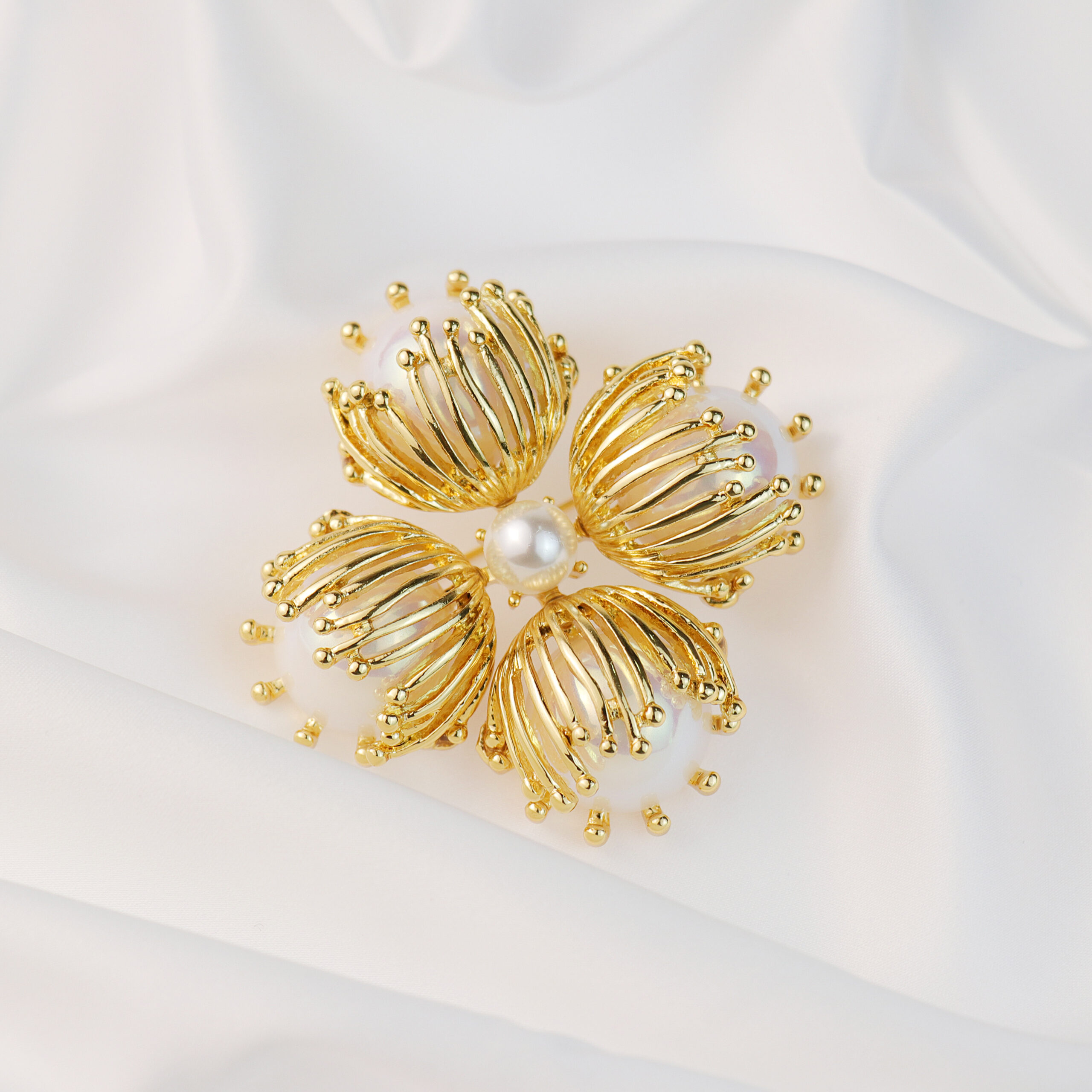 A brooch where four golden petals cradle luminous pearls, their delicate veins shimmering like sunlit whispers.