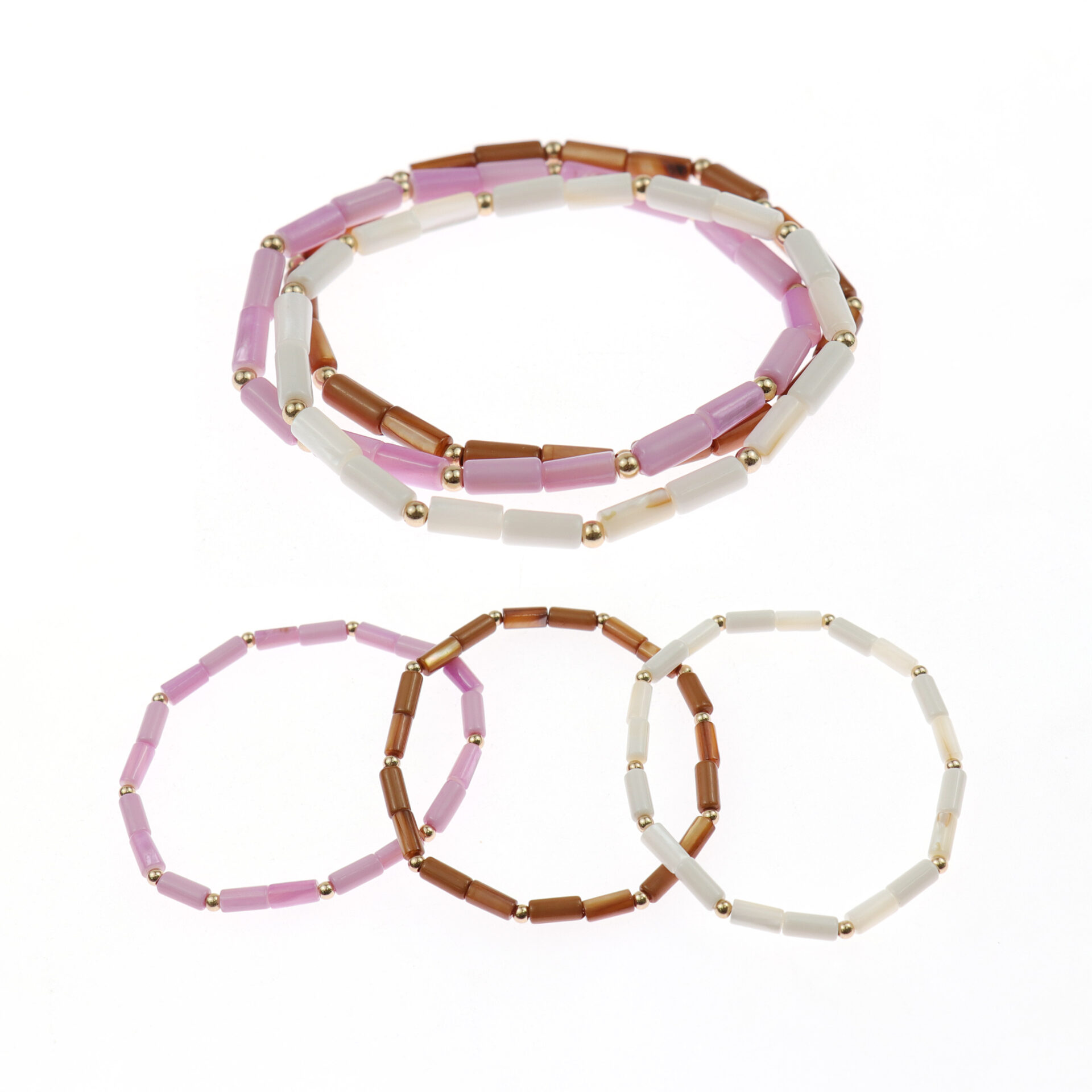Each bracelet is finished with an elastic band for a flexible, one-size-fits-all fit, and they can be worn alone or stacked to create a delicate, layered effect.