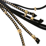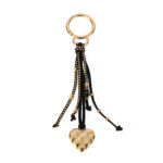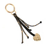 The bag charm has a metal ring at the top for attaching keys. Below, there are multiple black straps adorned with small golden rings.