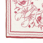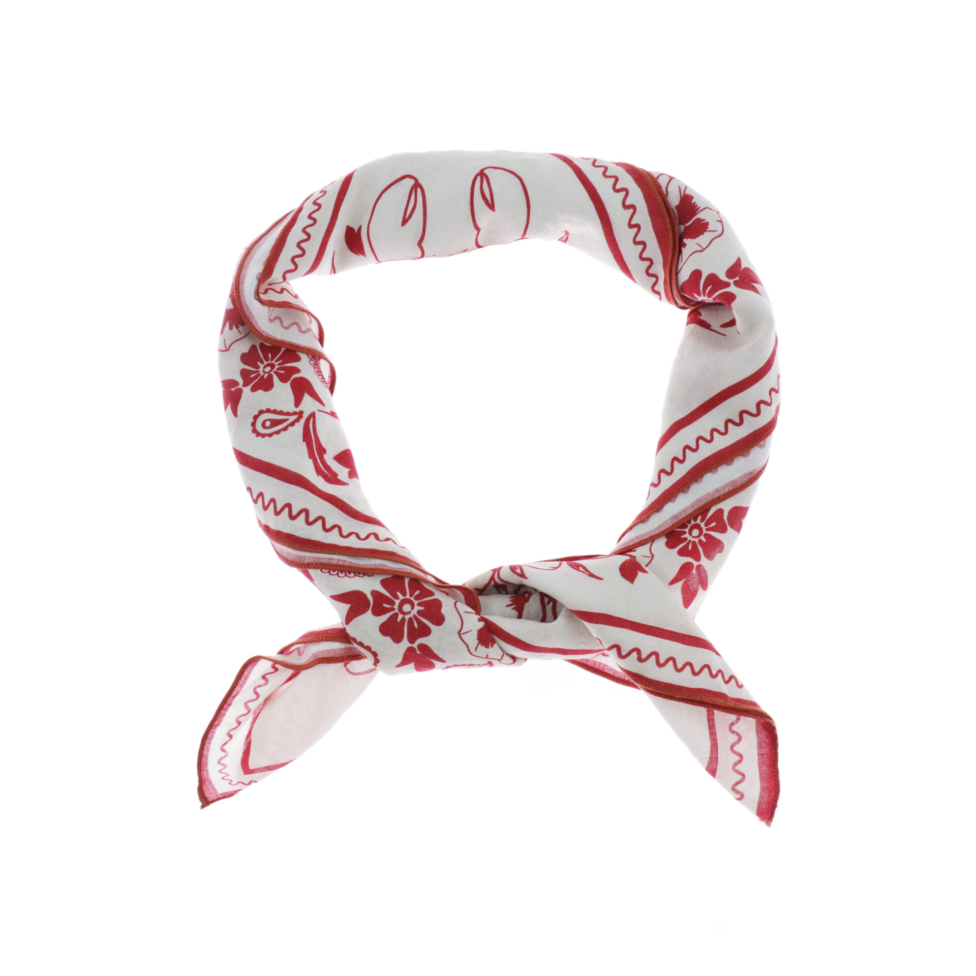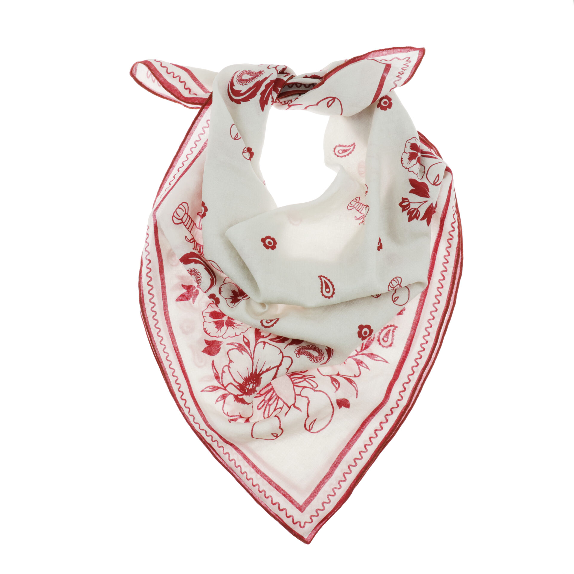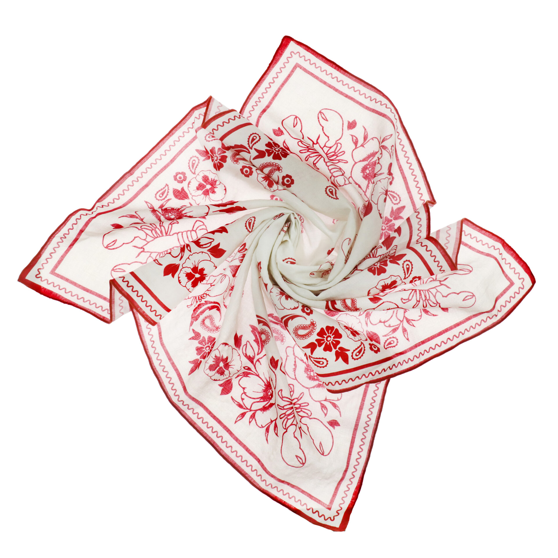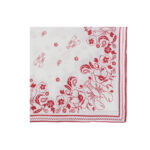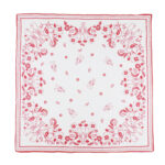 This bandana features a vintage red-and-white color scheme, blending floral motifs, paisley swirls, and delicate scalloped edge patterns to evoke both French romance and American retro charm.