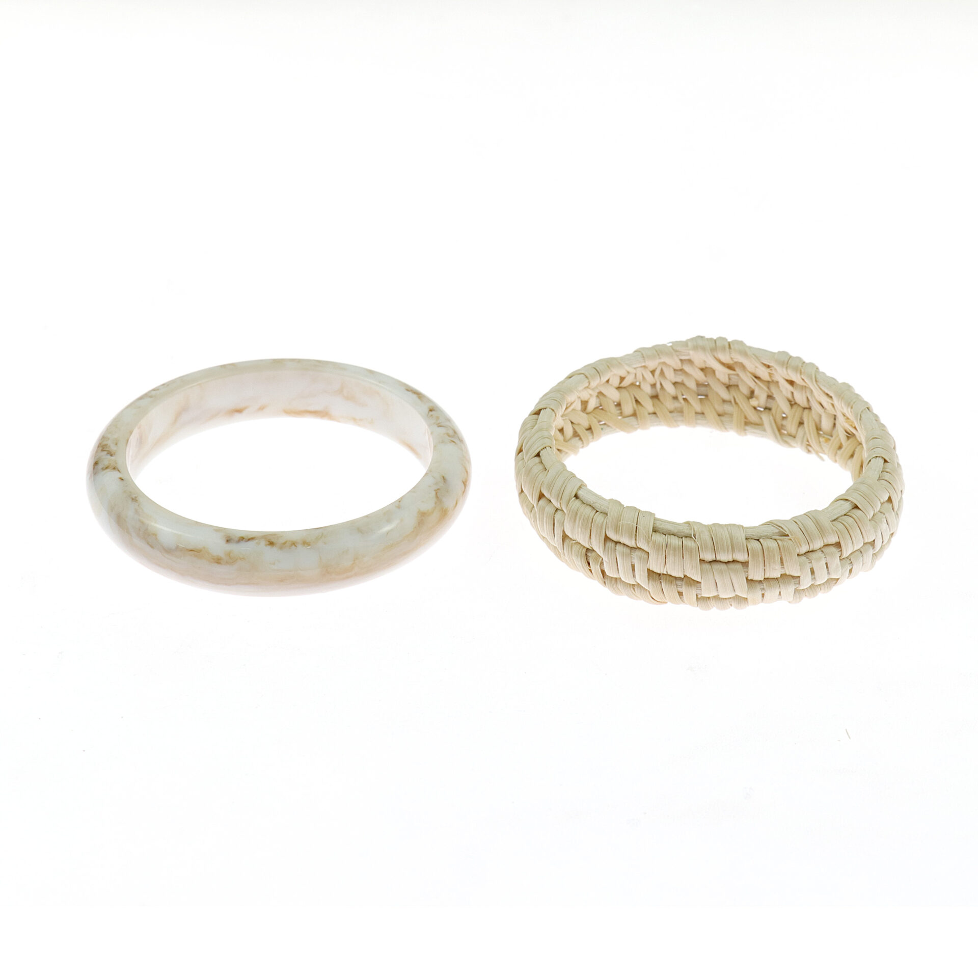 It is a set of two contrast-style bangles, featuring one smooth, marbled resin bangle in ivory and beige tones, and one hand-woven rattan bangle in a natural light straw color.